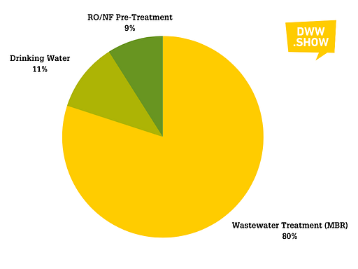 - 80% of the membranes are used in wastewater treatment. Widely as the workhorse of membrane bio-reactors, then also as pre-treatment for reuse processes